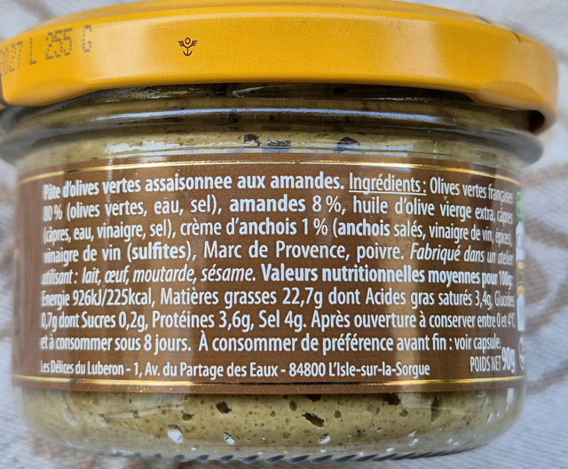 Une création gourmande qui marie le croquant des amandes avec la fraîcheur des olives vertes. Cette préparation artisanale offre un équilibre parfait entre la douceur des amandes et le goût légèrement piquant des olives vertes, enrichie d'une touche d'ail et d'herbes de Provence pour une expérience gustative authentique.